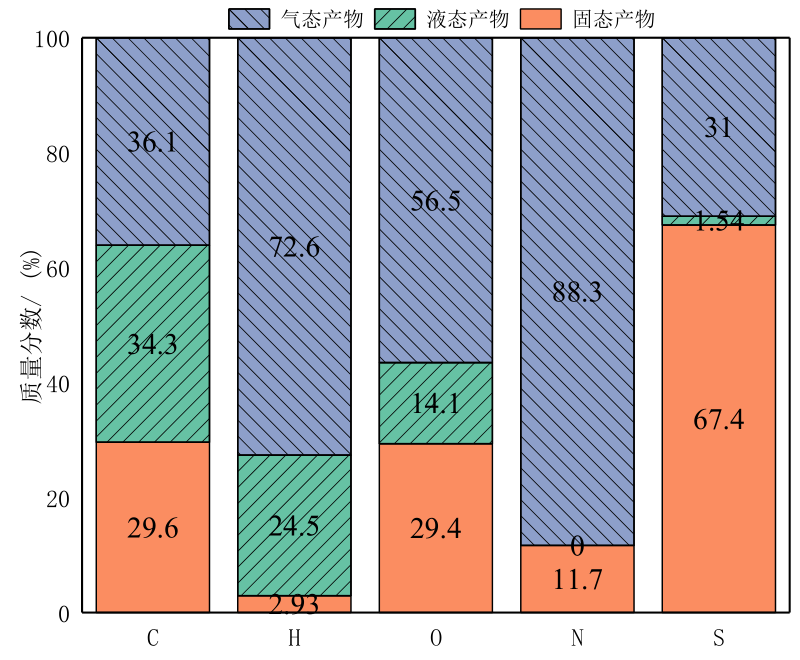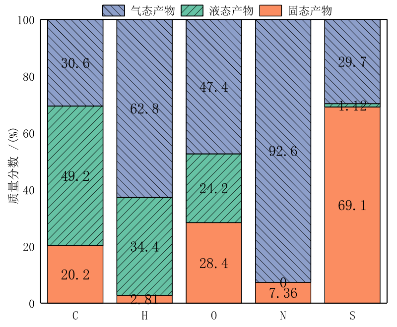 膠粉和機(jī)油共熱解時(shí)各種元素在三種產(chǎn)物中的分布